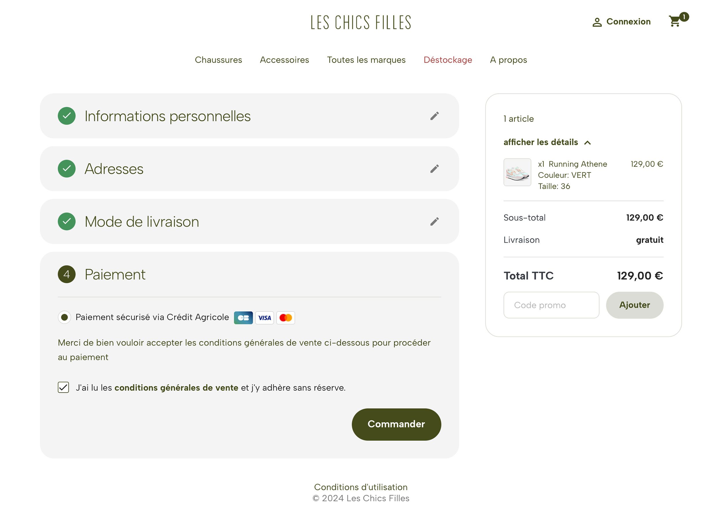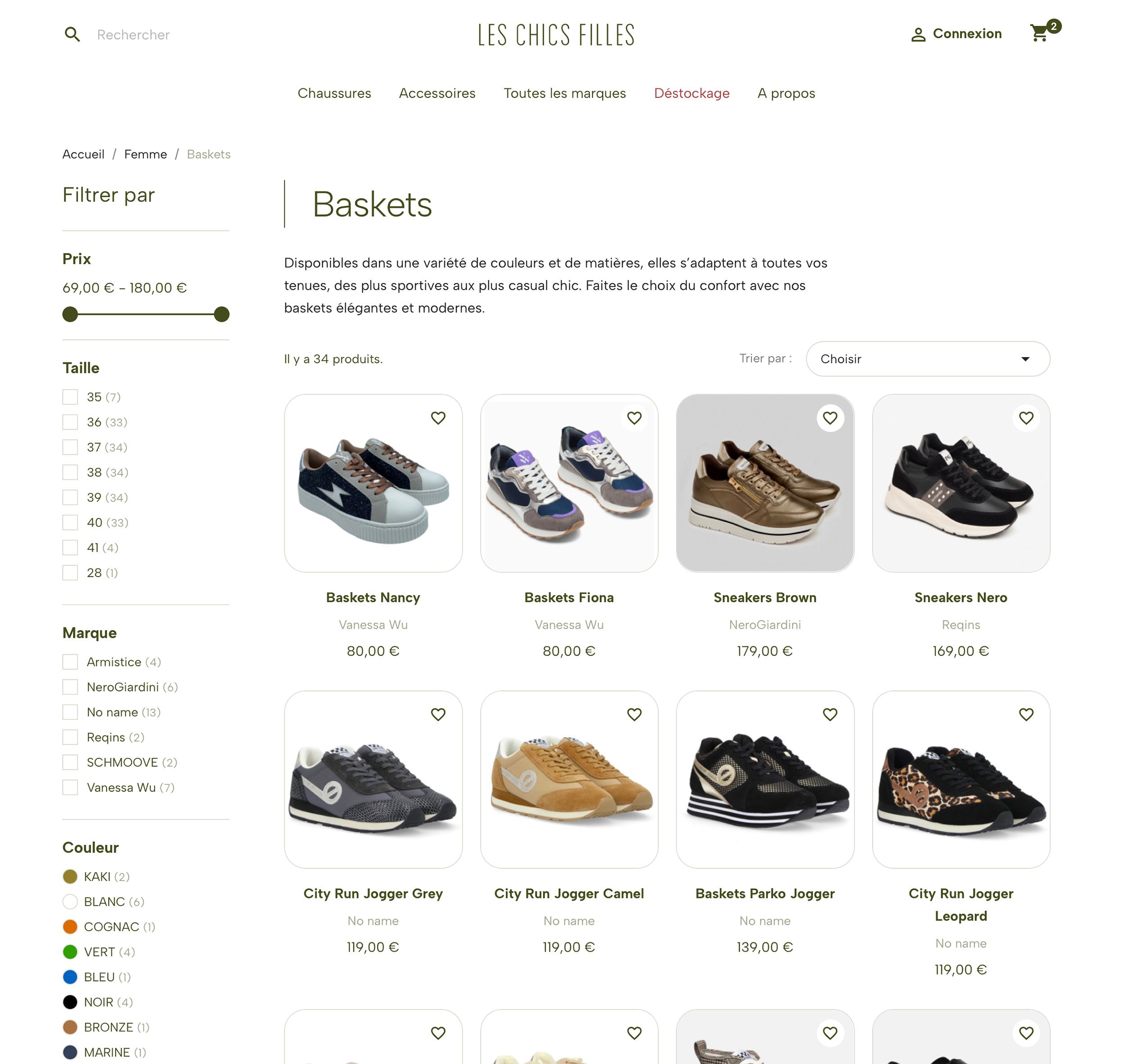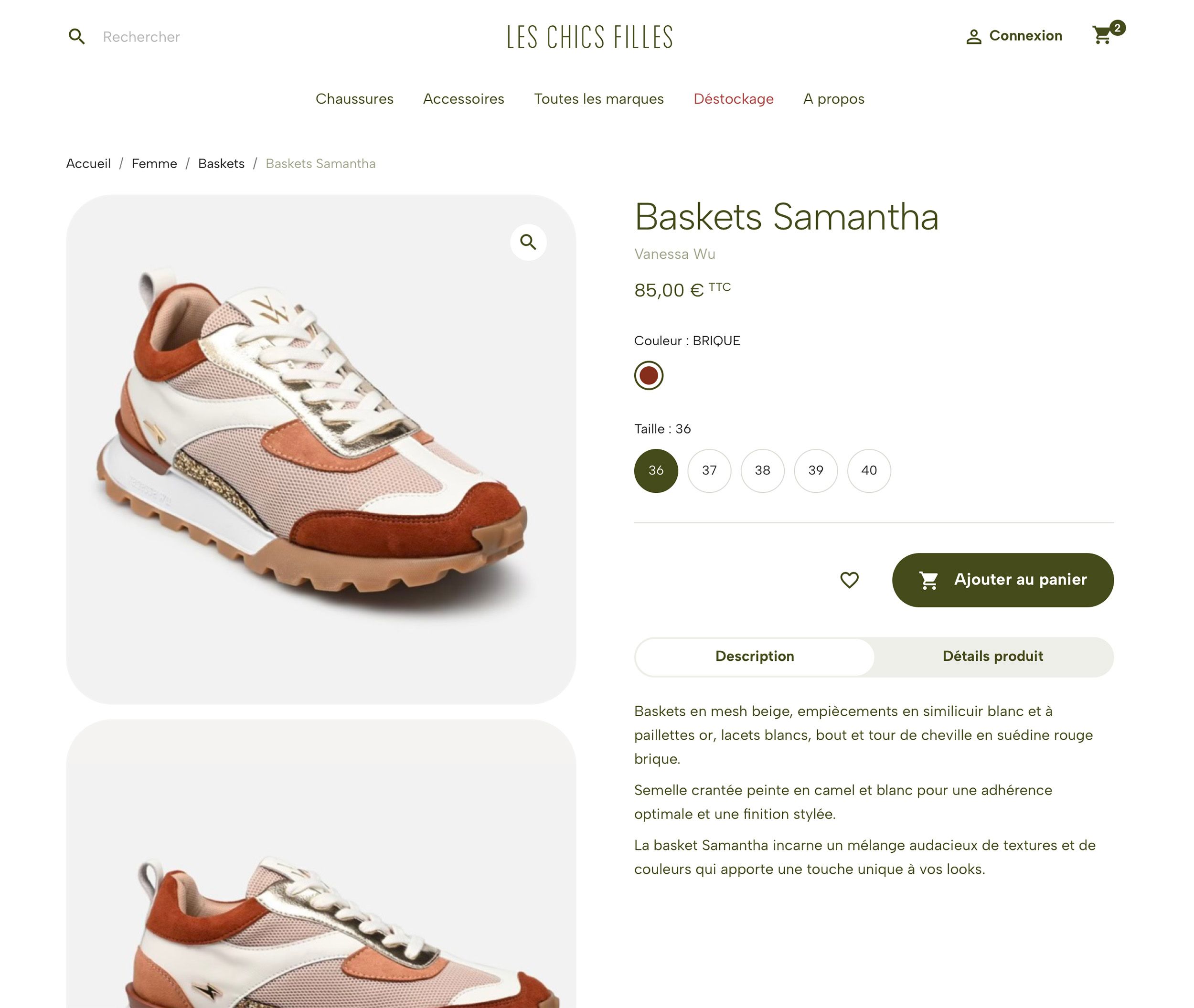 Les Chics Filles is a shoe boutique based in Rezé. The customer's wish was to extend the universe of her online boutique with a streamlined, minimalist e-shop that could be easily managed on PrestaShop. The store is stripped down to the essentials, with a great clean-up work compared to the default theme.